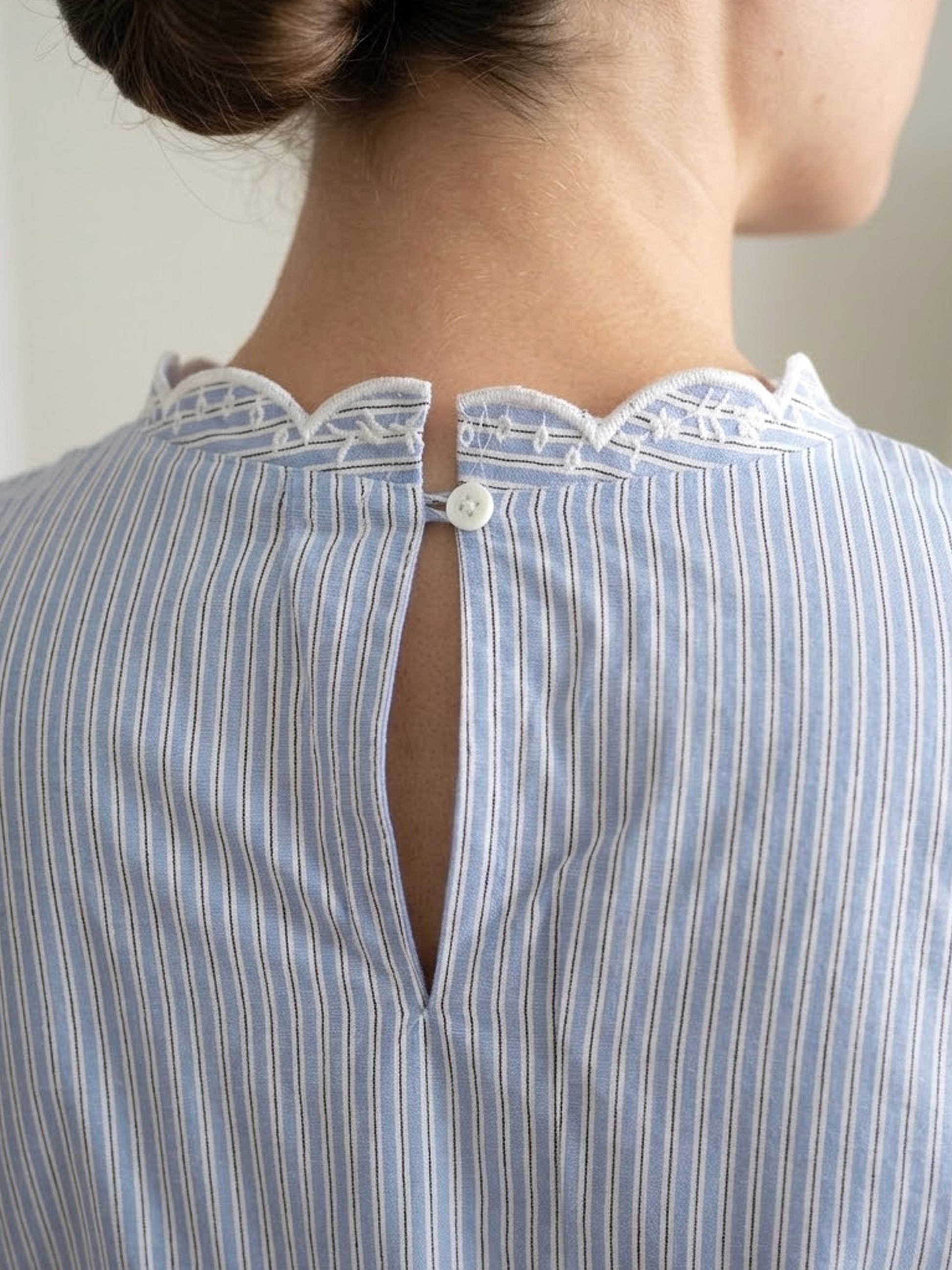 - Features a lightweight design with a charming scalloped neckline and back keyhole button