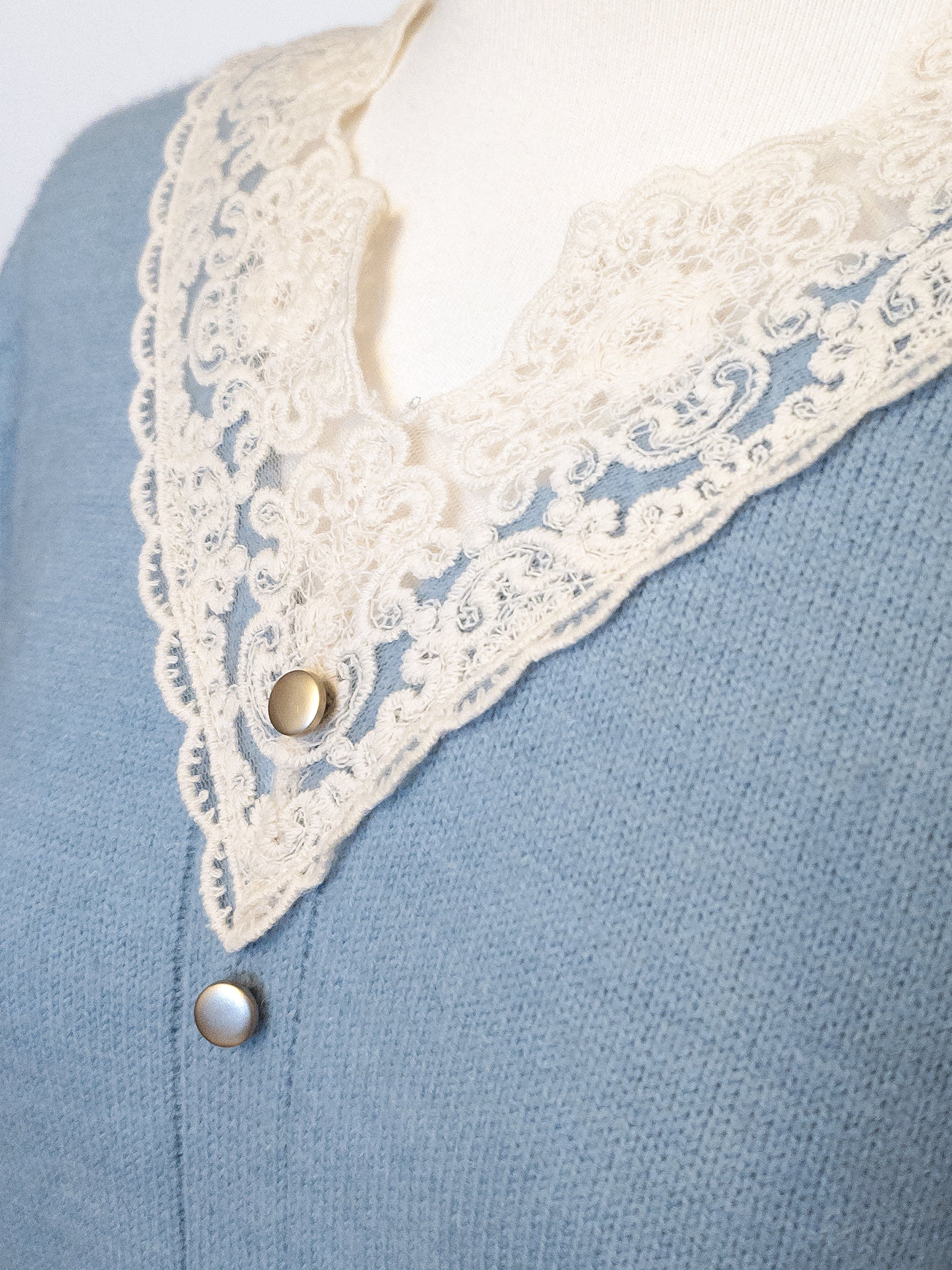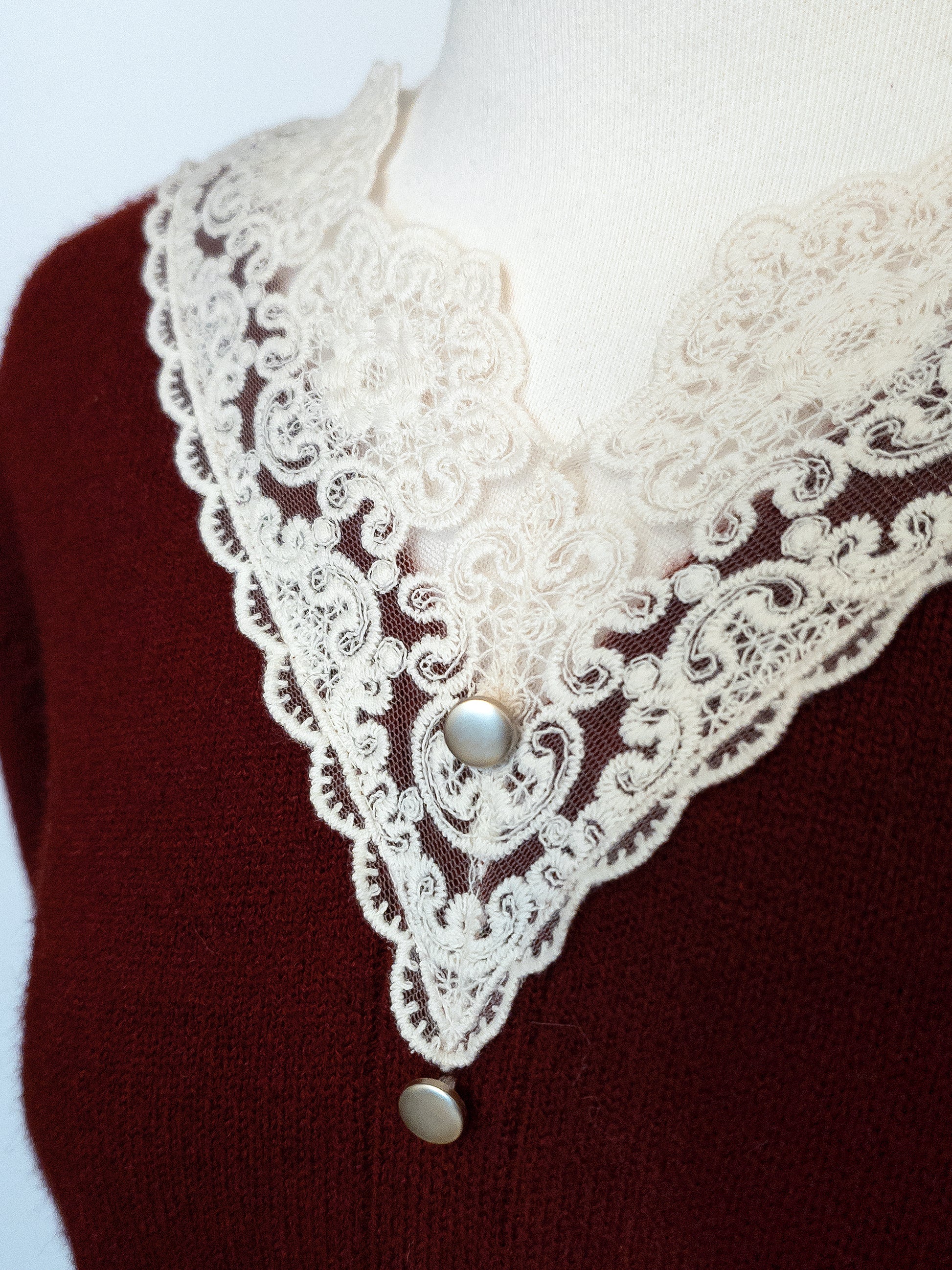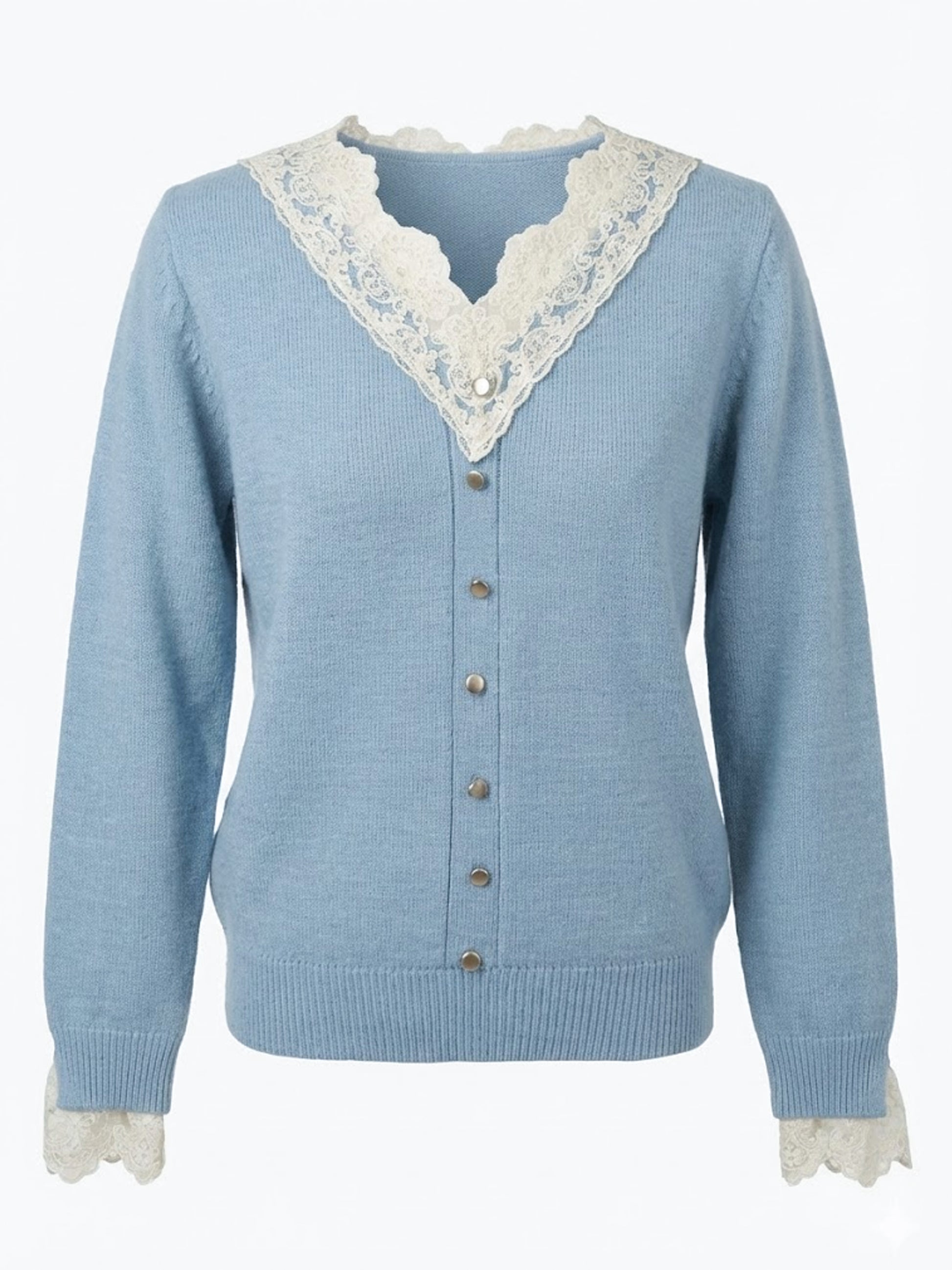 - Feminine V-neckline adorned with delicate, Victorian-inspired lace trim