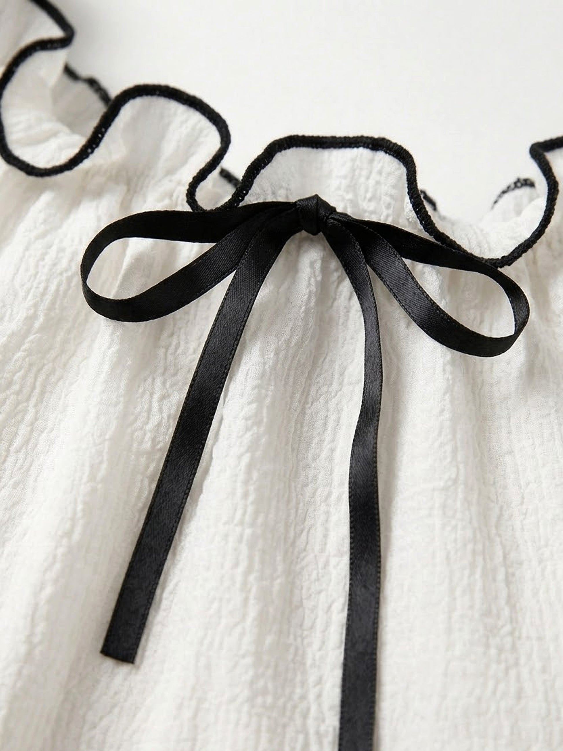 - Contrast black piping on ruffled edges with a front ribbon tie